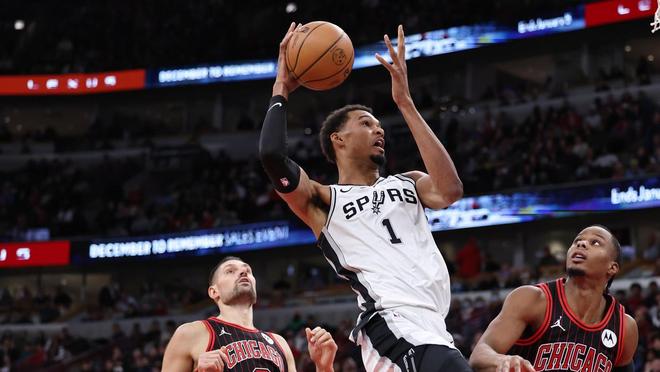 不過,馬刺球星文班亞馬的表現更為驚艷。在圣安東尼奧與芝加哥的比賽里,文班亞馬19中11,三分9中6,罰球10中10,狂轟38分12籃板5助攻1搶斷5蓋帽的超級兩雙數據。攻防兩端暴走的文班亞馬,在串聯球隊方面也有著突出的貢獻。